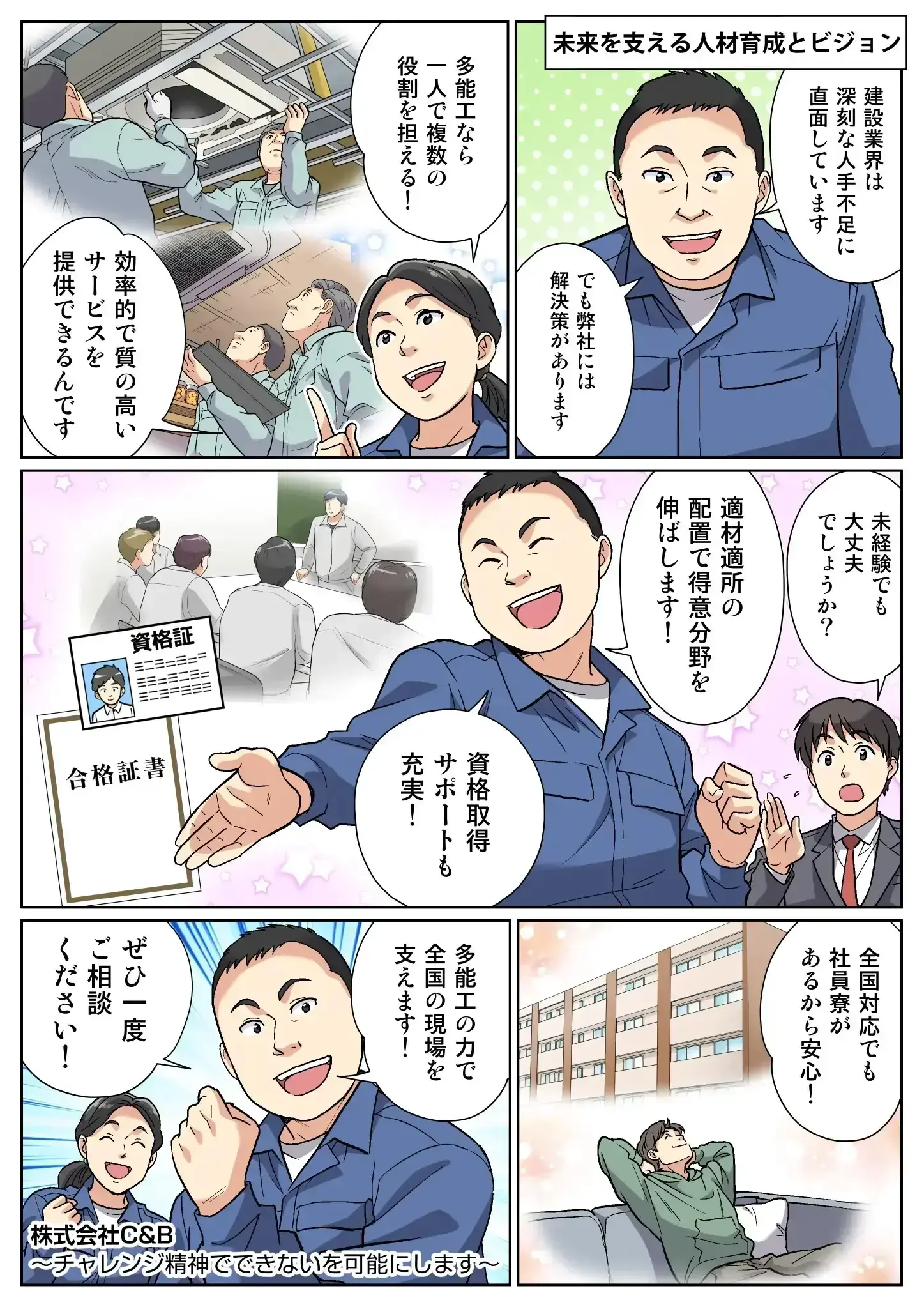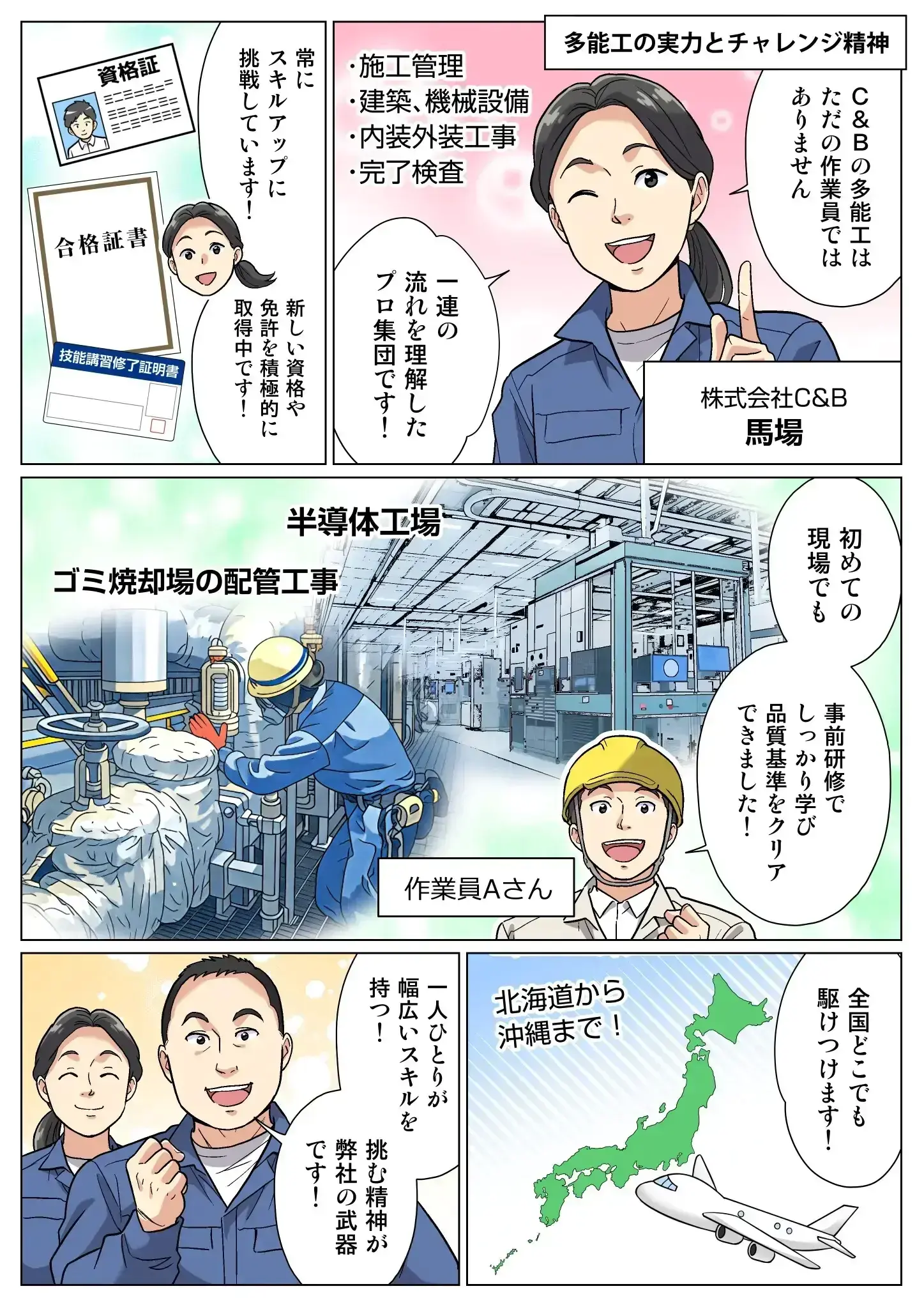 C&Bの原点である徳島から始まったのは、“未知を恐れず挑戦する”という姿勢。半導体関連施設や水揚げ場、焼却場などの未経験分野にも柔軟に対応してきました。やったことがない業務にも積極的に取り組み、徳島発の現場力で全国に信頼を築いています。